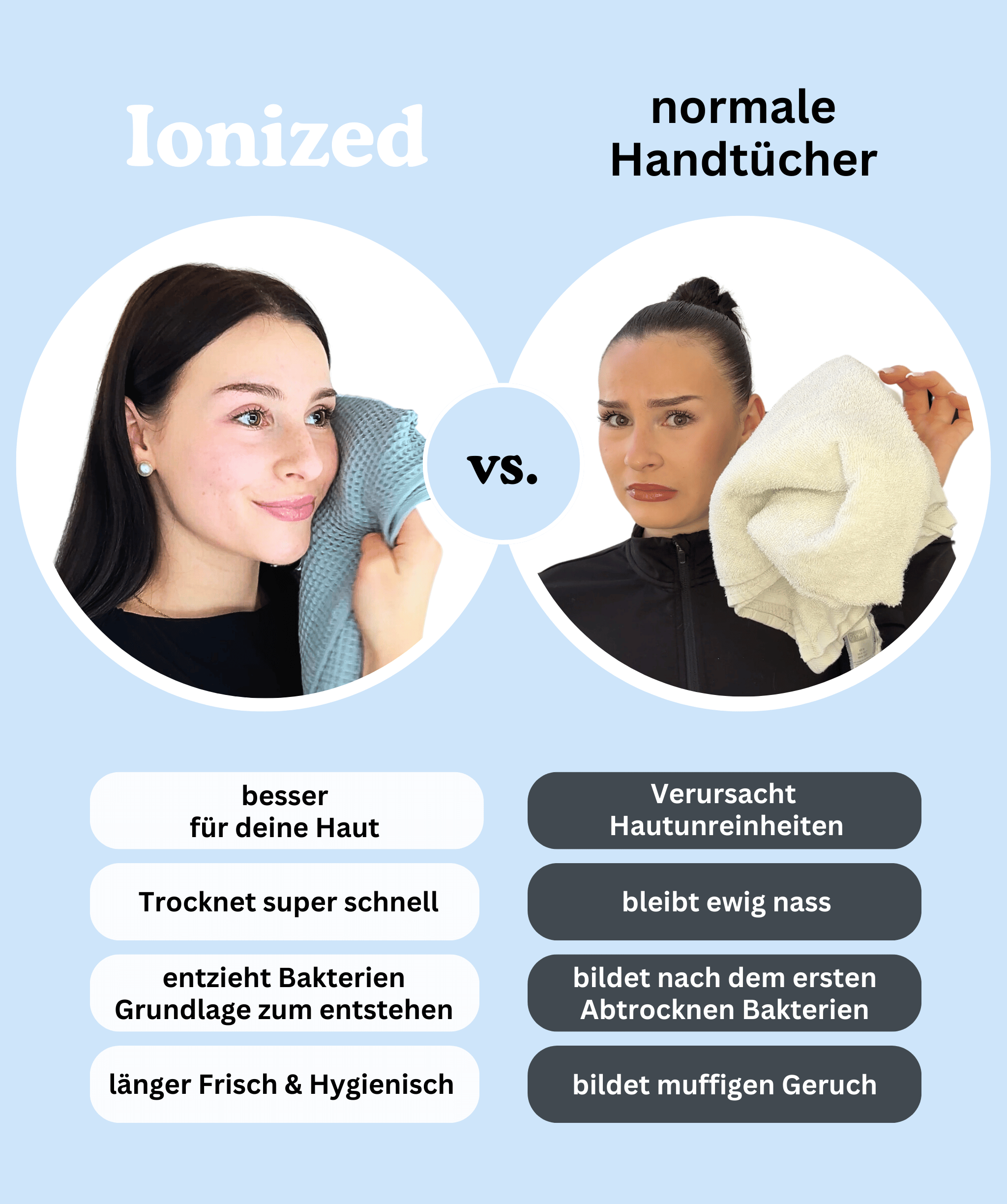 Unsere schnelltrocknenden Ionized Waffel-Handtücher bieten eine effektive Lösung, um diese Probleme zu vermeiden.