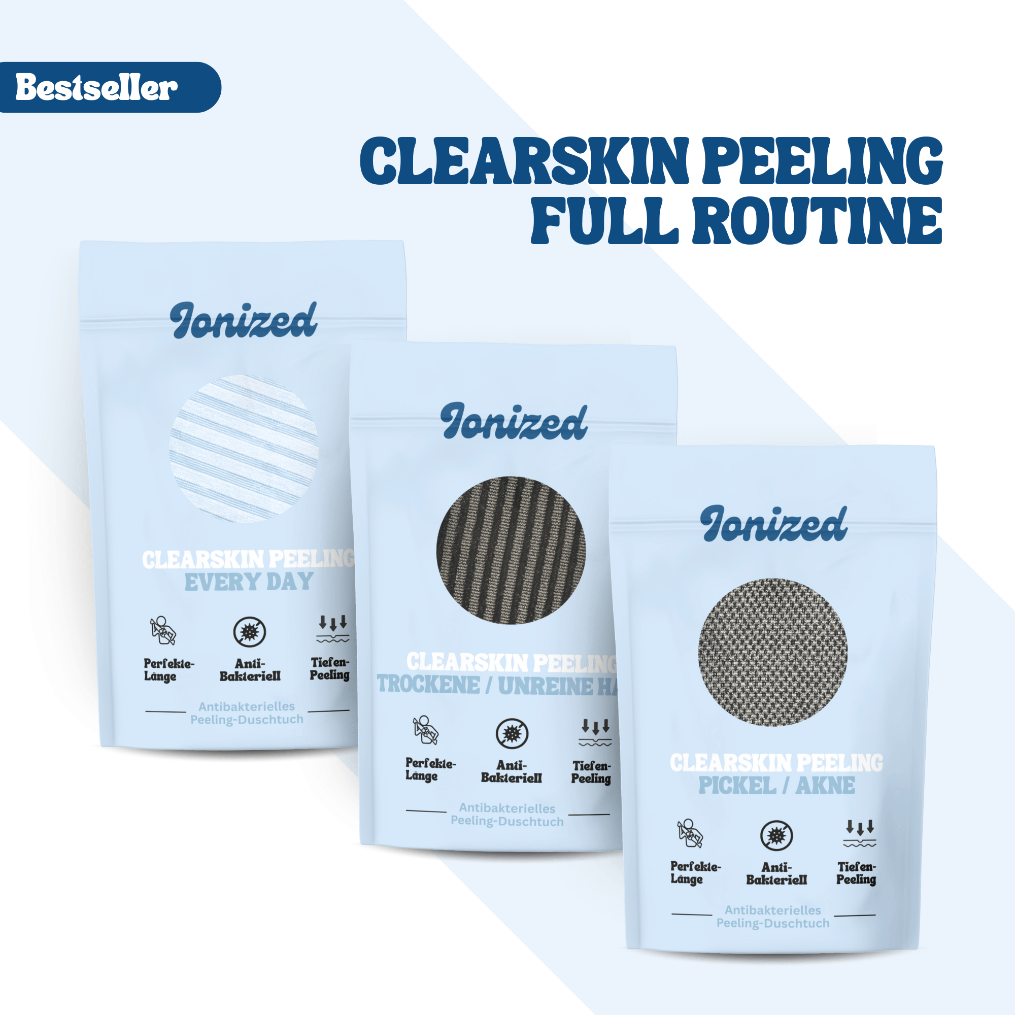 Die Ionized™ ClearSkin Routine umfasst 3 Peeling-Duschtücher – vom sanften Everyday-Tuch für glatte Haut, über das mittlere Tuch gegen trockene & unreine Haut bis hin zum intensiven Anti-Pickel-Tuch für Akne & hartnäckige Verhornungen. Gemeinsam decken sie jedes Hautproblem ab und sorgen für ein rundum reines Hautbild.