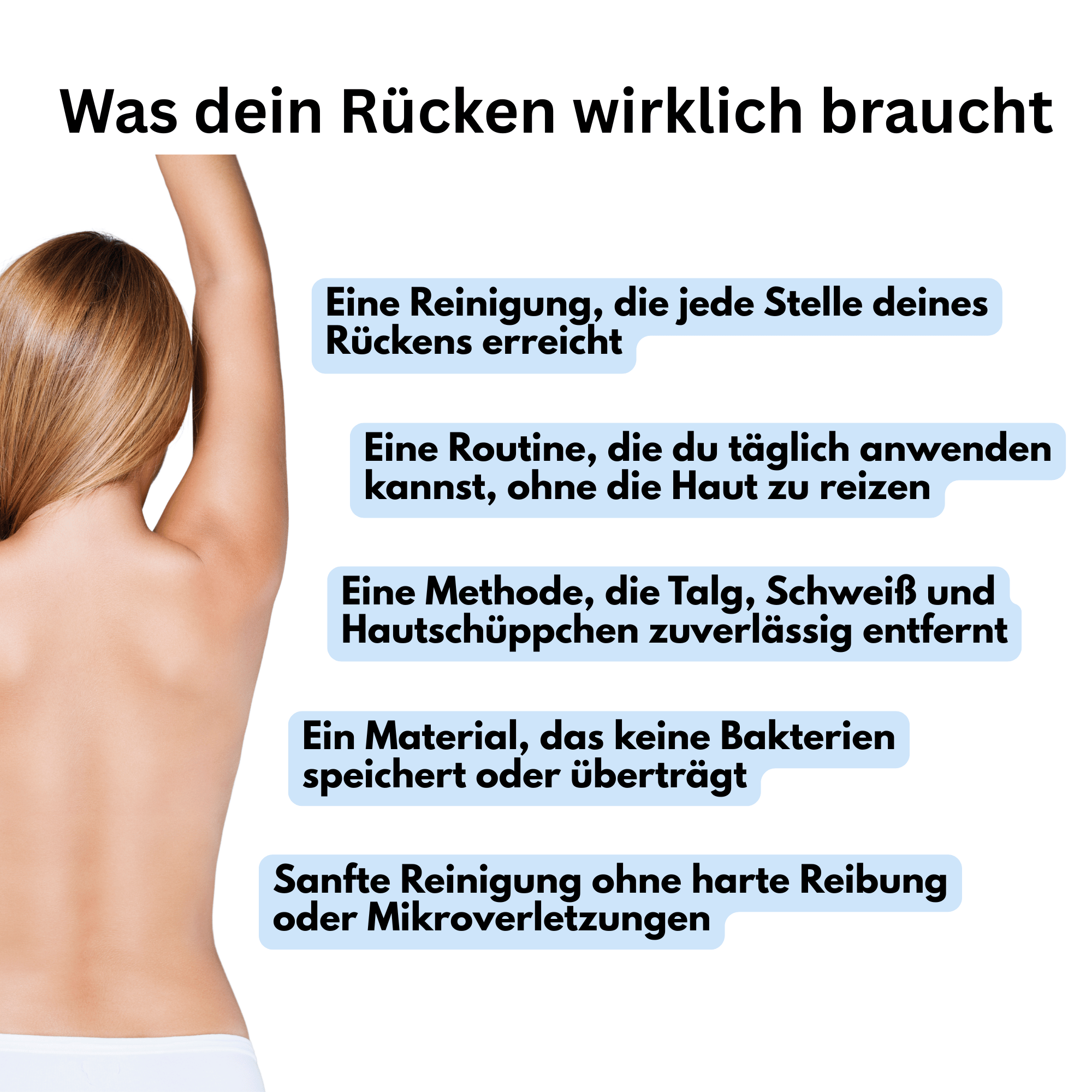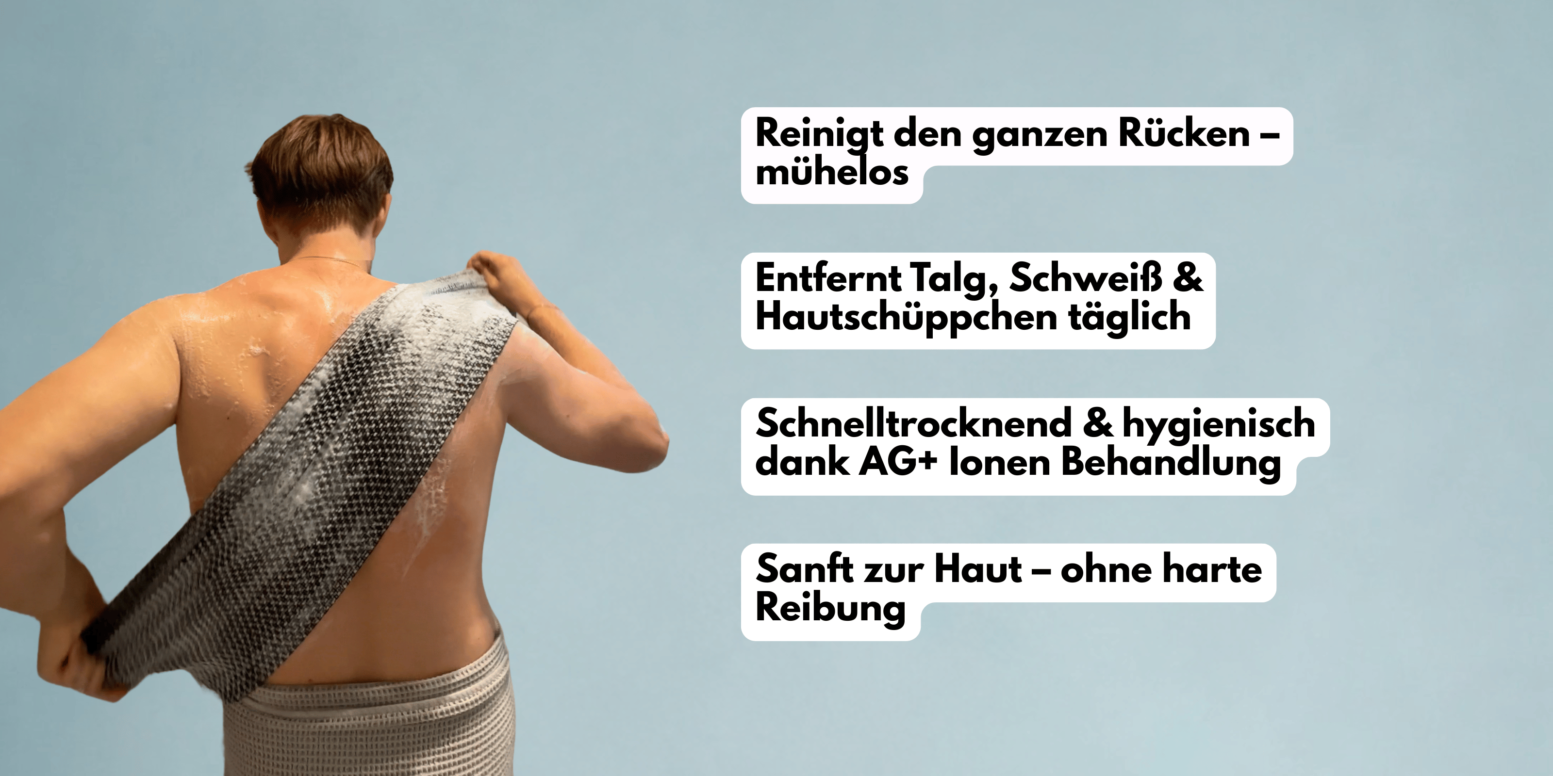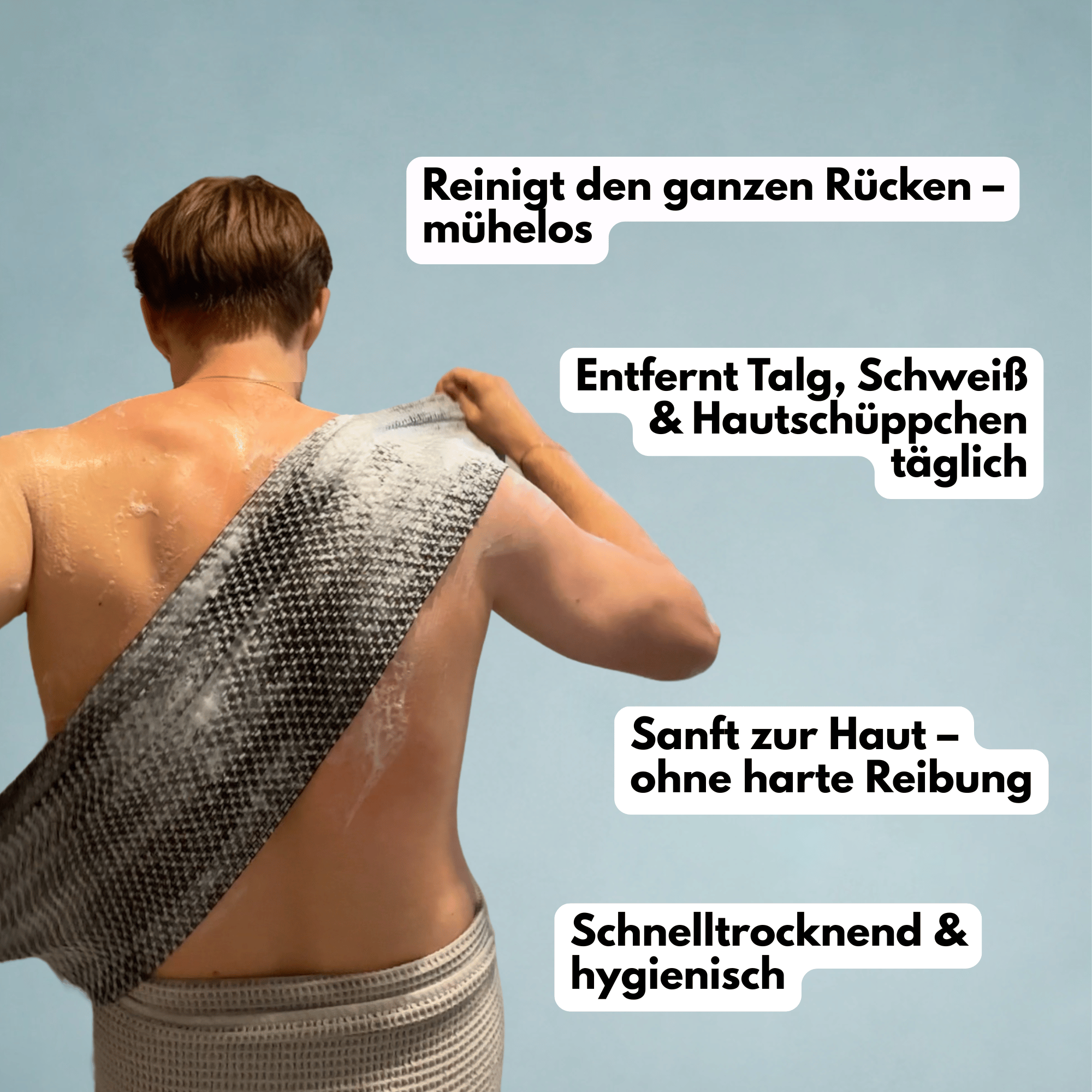 Die Haut am Rücken braucht vor allem eine regelmäßige, gründliche Reinigung, die Schweiß, Talg und Ablagerungen zuverlässig entfernt. Weil viele Bereiche kaum erreichbar sind, braucht es eine Methode, die diese Zonen trotzdem effektiv reinigt – ohne die Haut zu reizen. Gleichzeitig sollte die Rückenhaut möglichst wenig mit Bakterien und unnötiger Reibung in Kontakt kommen, da viele herkömmliche Duschutensilien Mikroverletzungen verursachen oder Keime übertragen – beides begünstigt Irritationen und Entzündungen.