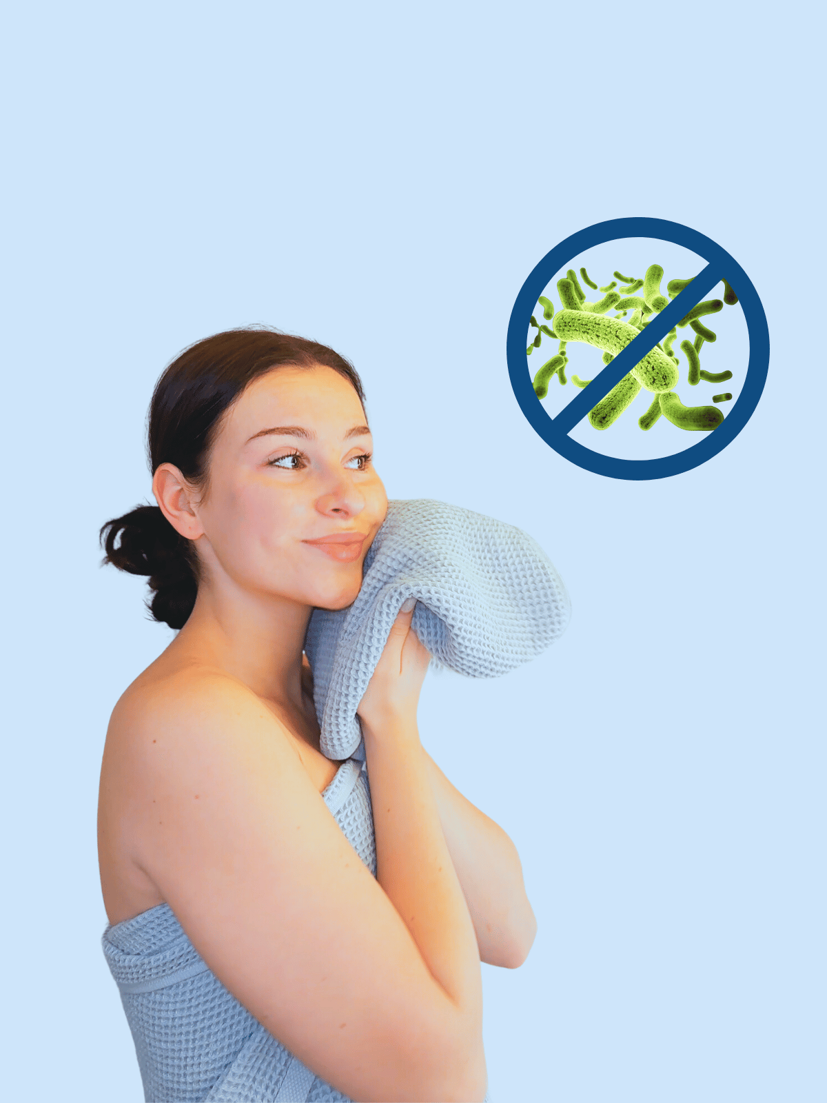 Das Ionized Skincare Handtuch verhindert die Entstehung solcher Bakterien, sodass dein Körper sauber nach dem Abtrocknen bleibt.